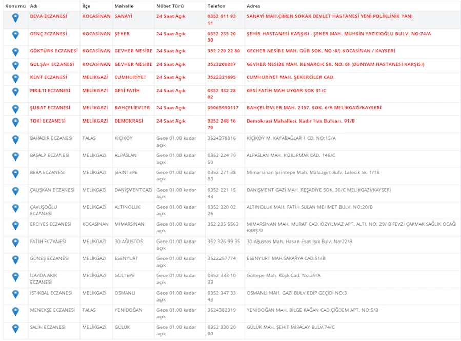 Kayseri'de vatandaşların acil sağlık ihtiyaçları için nöbetçi eczaneler önemli bir yere sahip. Kayseri’nin bugünkü nöbetçi eczanelerini sizler için derledik. 30 Ağustos Cumartesi nöbetçi eczaneler listesine buradan ulaşabilirsiniz. İşte 30 Ağustos nöbetçi eczaneler…