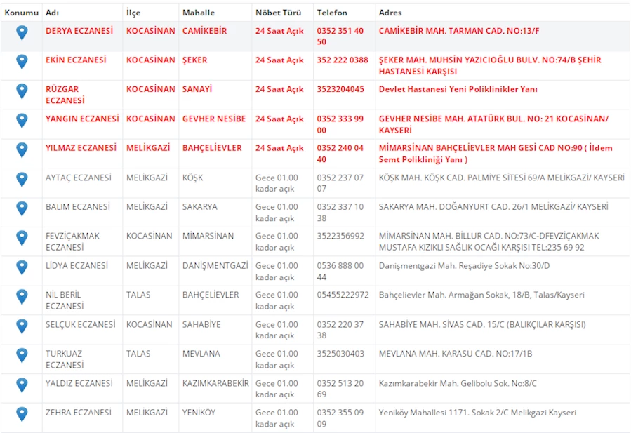 Kayseri'de vatandaşların acil sağlık ihtiyaçları için nöbetçi eczaneler önemli bir yere sahip. Kayseri’nin bugünkü nöbetçi eczanelerini sizler için derledik. 30 Ocak Perşembe nöbetçi eczaneler listesine buradan ulaşabilirsiniz. İşte 30 Ocak nöbetçi eczaneler…