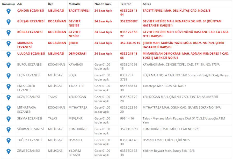 Kayseri'de vatandaşların acil sağlık ihtiyaçları için nöbetçi eczaneler önemli bir yere sahip. Kayseri’nin bugünkü nöbetçi eczanelerini sizler için derledik. 30 Temmuz Çarşamba nöbetçi eczaneler listesine buradan ulaşabilirsiniz. İşte 30 Temmuz nöbetçi eczaneler…