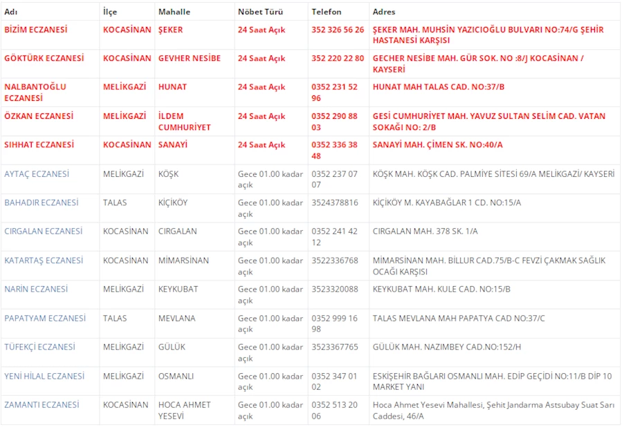 Öte yandan nöbetçi eczaneler, anlık üşütme, zehirlenme vakaları veya ilaçların yan etkileri gibi acil sağlık sorunlarına da müdahale etme konusunda da yetkinlik sahibi olurken, bugünkü nöbetçi eczaneleri sizler için derledik. Kayseri'de bugün hangi nöbetçi eczaneler açık?