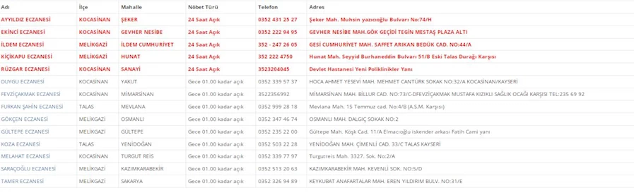 Kayseri'de vatandaşların acil sağlık ihtiyaçları için nöbetçi eczaneler önemli bir yere sahip. Kayseri’nin bugünkü nöbetçi eczanelerini sizler için derledik. 8 Aralık Pazar nöbetçi eczaneler listesine buradan ulaşabilirsiniz. İşte 8 Aralık nöbetçi eczaneler…