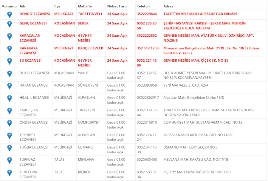 Kayseri'de vatandaşların acil sağlık ihtiyaçları için nöbetçi eczaneler önemli bir yere sahip. Kayseri’nin bugünkü nöbetçi eczanelerini sizler için derledik. 8 Eylül Pazartesi nöbetçi eczaneler listesine buradan ulaşabilirsiniz. İşte 8 Eylül nöbetçi eczaneler…