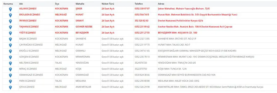Kayseri'de vatandaşların acil sağlık ihtiyaçları için nöbetçi eczaneler önemli bir yere sahip. Kayseri’nin bugünkü nöbetçi eczanelerini sizler için derledik. 9 Ekim Perşembe nöbetçi eczaneler listesine buradan ulaşabilirsiniz. İşte 9 Ekim nöbetçi eczaneler…
