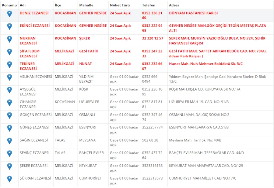Kayseri'de vatandaşların acil sağlık ihtiyaçları için nöbetçi eczaneler önemli bir yere sahip. Kayseri’nin bugünkü nöbetçi eczanelerini sizler için derledik. 9 Eylül Salı nöbetçi eczaneler listesine buradan ulaşabilirsiniz. İşte 9 Eylül nöbetçi eczaneler…