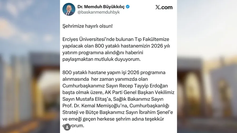 Kayseri, sağlıkta gücüne güç katmaya devam ederken, bu alandaki yeni bir gelişmeyi Büyükşehir Belediye Başkanı Dr. Memduh Büyükkılıç paylaştı. Başkan Büyükkılıç, Kayseri’nin sağlık alanında bölgesel bir merkez olma vizyonunun kararlılıkla sürdüğünü belirterek, "Erciyes Üniversitesi’nde bulunan Tıp Fakültemize yapılacak olan 800 yataklı hastane projesinin 2026 yılı yatırım programına alındığı haberini paylaşmaktan mutluluk duyuyorum" dedi.