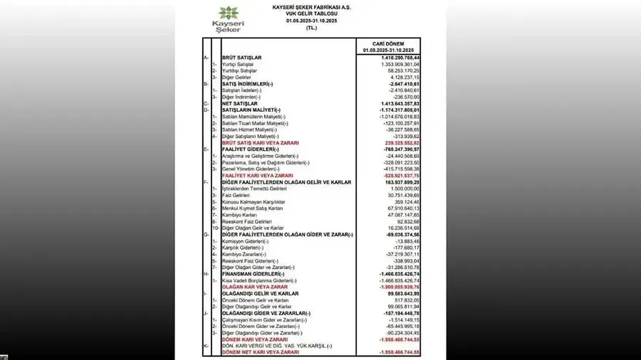 Kayseri Şeker Fabrikası A.Ş.’nin 2025 yılına ait resmî mali belgeleri kamuoyuna yansıdı. VUK (Vergi Usul Kanunu) gelir tablosu verilerine göre şirket, sadece 1 Mayıs - 31 Ekim 2025 döneminde 1 milyar 958 milyon 466 bin TL net zarar yazdı. Altı aylık bu zarar, Kayseri Şeker’in mali yapısına ilişkin ciddi soru işaretlerini de beraberinde getirdi.