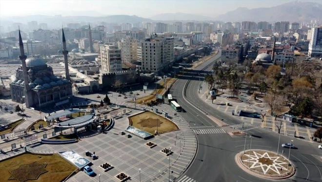 İçişleri Bakanlığı tarafından korona virüs ile mücadele kapsamında hafta sonu uygulanan 72 saatlik sokağa çıkma kısıtlamasında Kayseri sessiz kaldı. Normal günlerde araç ve yaya yoğunluğunun çok olduğu Cumhuriyet meydanı, vatandaşlar evlerinde kalınca boş kaldı. Meydan da yaşanan sakinlik ise havadan görüntülendi.