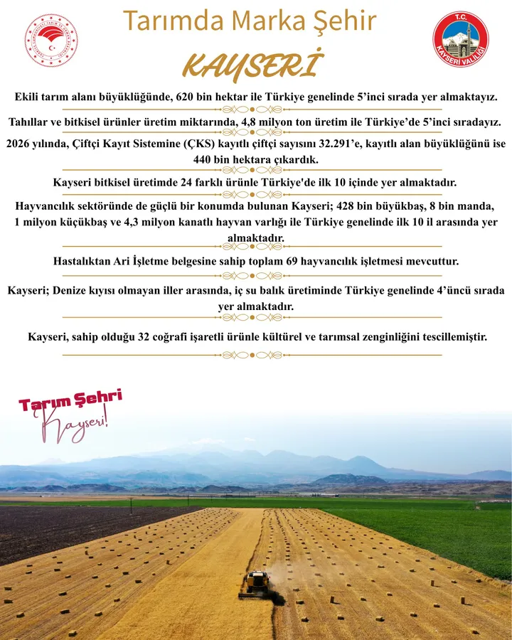 24 farklı üründe ilk 10’da yer alan Kayseri, birçok başlıkta zirveye oynuyor. Milyonları aşan hayvan varlığı, iç su balıkçılığındaki başarısı ve coğrafi işaretli ürünleriyle şehir, tarımda “ben de varım” demekle kalmadı, oyunun kurallarını değiştirdi.