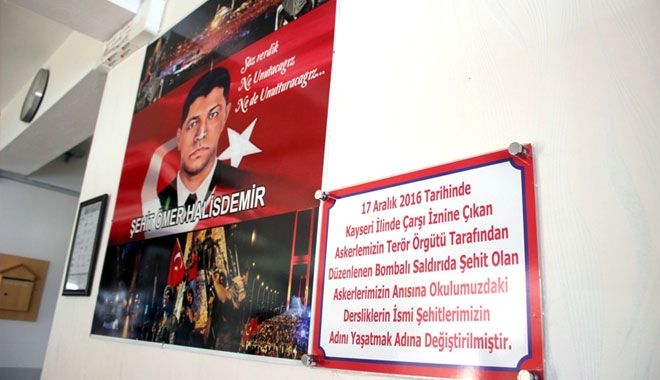 Kayseri´de geçen yıl 17 Aralık´ta meydana gelen terör patlaması sonucunda şehit olan 14 askerin adı, Talas Süleymanlı Köyü Mehmet Muammer Beluk Çok Programlı Anadolu Lisesi´ndeki sınıflara verildi.