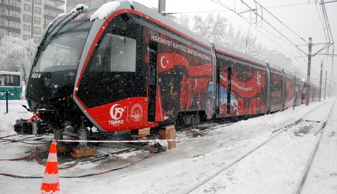 Kayseri´de, tramvay kar yağışı nedeniyle kayarak raydan çıktı.