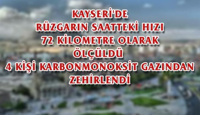 Kayseri´de sabah saat 04.00´da başlayan şiddetli rüzgar şehir merkezinde etkili oldu. Meteoroloji Bölge Müdürlüğü yetkililerinden alınan bilgiye göre rüzgarın saatteki hızı 72 kilometre olarak ölçüldü. Şiddetli rüzgar nedeniyle Talas ilçesine bağlı Bahçelievler Mahallesi Haymana 1 Sokak´ta bir anne ve 3 çocuğu karbonmonoksit gazından zehirlendi.