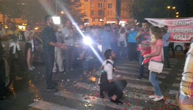Kürşat Esendemir (25) isimli genç Alparslan mahallesinde bulunan bir alışveriş merkezinde çalışan kız arkadaşı Aslıhan Kip´e (25) evlenme teklif etmek için sürpriz bir program hazırladı. Genç kızın işten çıkış saatini bekleyen genç ve arkadaşları konfeti ve havai fişeklerle hazırlıklarını tamamladı. Genç kızın kapıdan çıkmasıyla birlikte kalabalık konfetileri patlatırken ?Benimle Evlenir Misin Aslım´ yazılı pankartı açtı. Gördükleriyle şok olan Aslıhan Kip´in önünde diz çöken Esendemir, evlilik teklifi yaptı. Kip´in ?Evet´ cevabını vermesiyle çevredeki kalabalık da alkışlarla çiftin mutluluklarına ortak oldu.