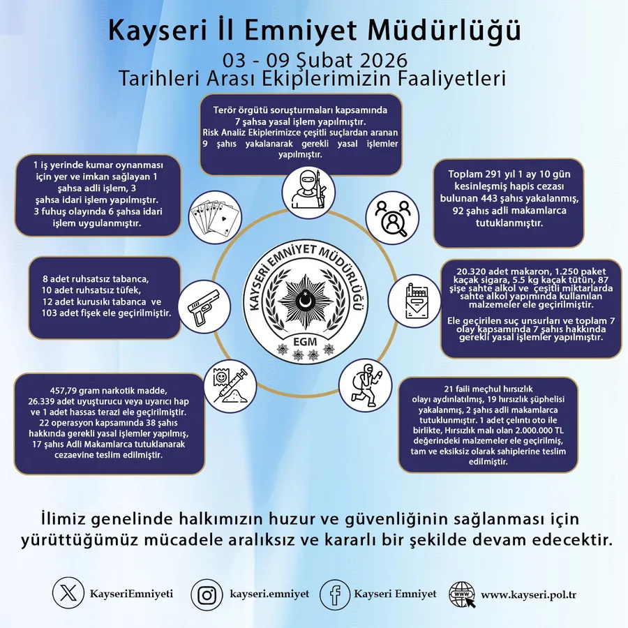 Kayseri İl Emniyet Müdürlüğü, 03–09 Şubat 2026 tarihleri arasında kent genelinde yürütülen asayiş, terör, narkotik ve kaçakçılık operasyonlarının bilançosunu paylaştı. Açıklanan verilere göre, suç ve suçlularla mücadele kapsamında çok sayıda şahıs hakkında adli ve idari işlem yapıldı.