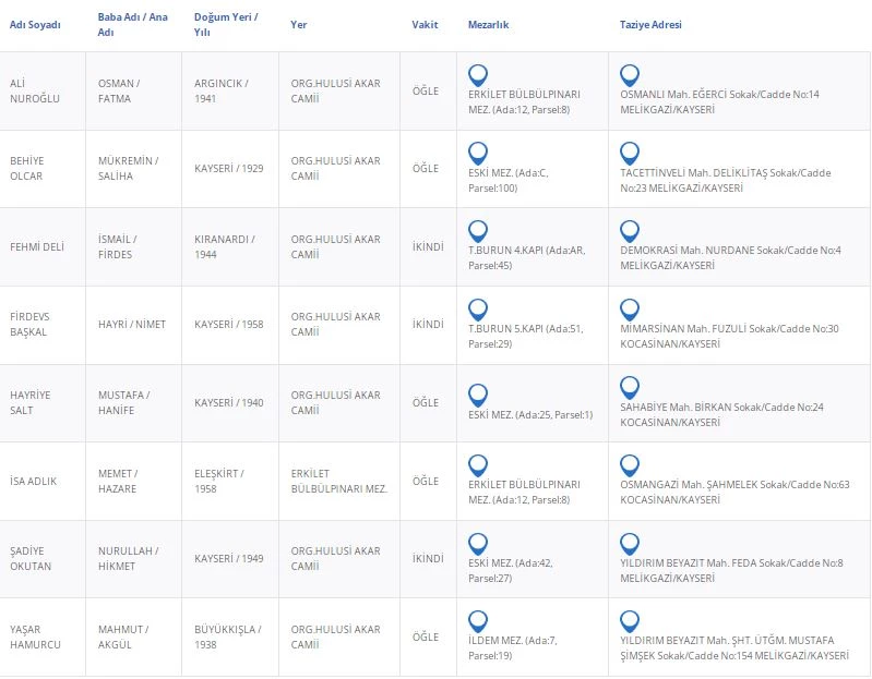 Kayseri Büyükşehir Belediyesi'nden alınan bilgilere göre, vefat eden vatandaşlarımızın bilgileri şu şekilde: