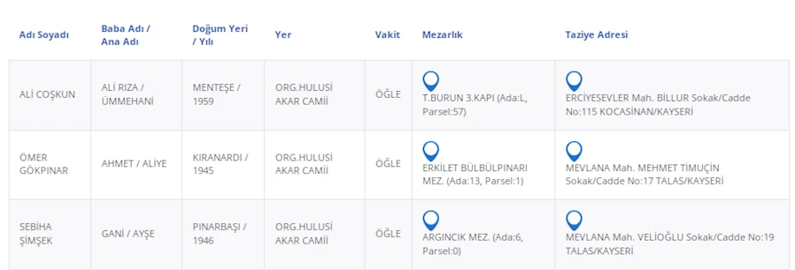 Kayseri Büyükşehir Belediyesi'nden alınan bilgilere göre, vefat eden vatandaşlarımızın bilgileri şu şekilde: