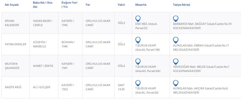 Kayseri Büyükşehir Belediyesi'nden alınan bilgilere göre, vefat eden vatandaşlarımızın bilgileri şu şekilde: