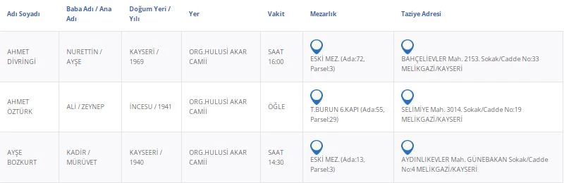 Kayseri Büyükşehir Belediyesi'nden alınan bilgilere göre, vefat eden vatandaşlarımızın bilgileri şu şekilde: