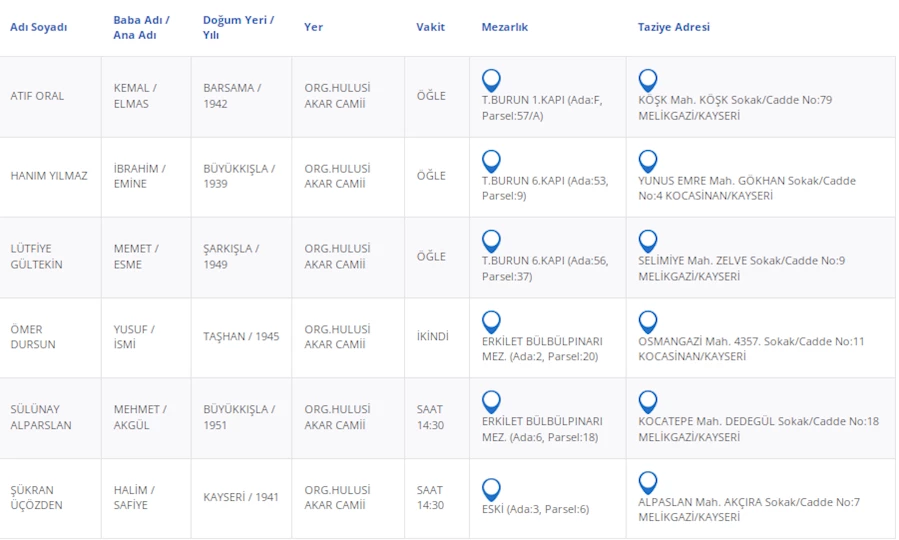Kayseri Büyükşehir Belediyesi'nden alınan bilgilere göre, vefat eden vatandaşlarımızın bilgileri şu şekilde: