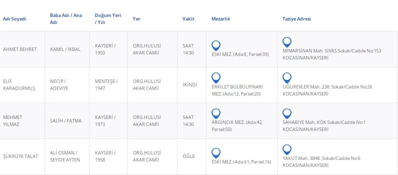 Kayseri Büyükşehir Belediyesi'nden alınan bilgilere göre, vefat eden vatandaşlarımızın bilgileri şu şekilde: