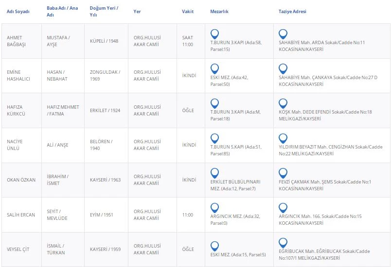 Kayseri Büyükşehir Belediyesi'nden alınan bilgilere göre, vefat eden vatandaşlarımızın bilgileri şu şekilde: