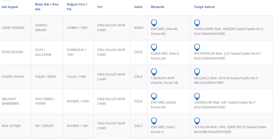 Kayseri Büyükşehir Belediyesi'nden alınan bilgilere göre, vefat eden vatandaşlarımızın bilgileri şu şekilde: