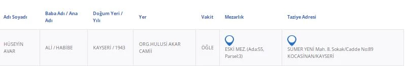 Kayseri Büyükşehir Belediyesi'nden alınan bilgilere göre, vefat eden vatandaşlarımızın bilgileri şu şekilde: