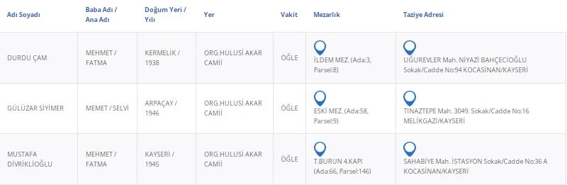 Kayseri Büyükşehir Belediyesi'nden alınan bilgilere göre, vefat eden vatandaşlarımızın bilgileri şu şekilde: