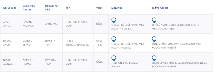 Kayseri Büyükşehir Belediyesi'nden alınan bilgilere göre, vefat eden vatandaşlarımızın bilgileri şu şekilde:
