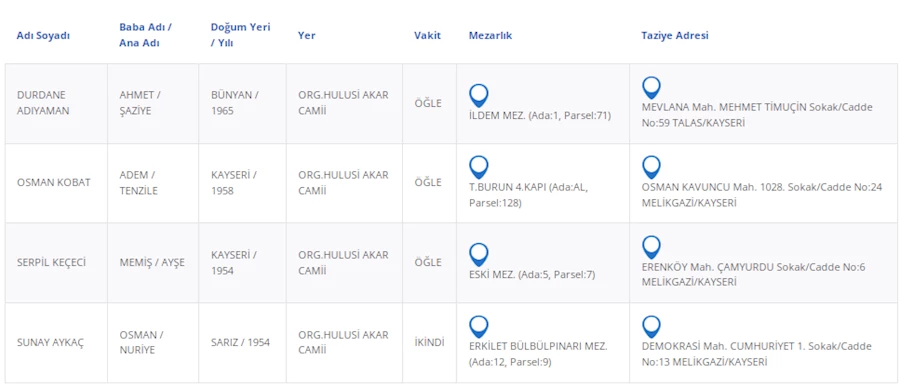 Kayseri Büyükşehir Belediyesi'nden alınan bilgilere göre, vefat eden vatandaşlarımızın bilgileri şu şekilde:
