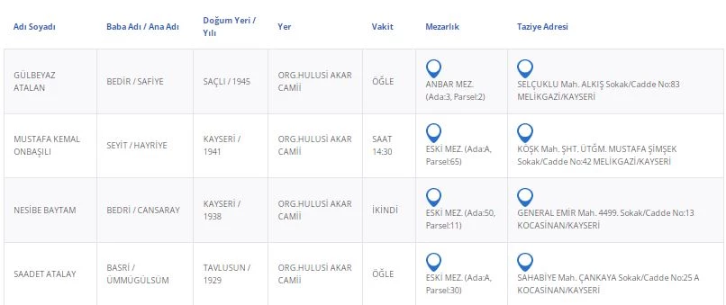 Kayseri Büyükşehir Belediyesi'nden alınan bilgilere göre, vefat eden vatandaşlarımızın bilgileri şu şekilde:
