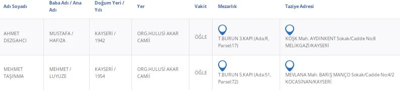 Kayseri Büyükşehir Belediyesi'nden alınan bilgilere göre, vefat eden vatandaşlarımızın bilgileri şu şekilde: