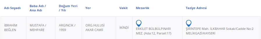 Kayseri Büyükşehir Belediyesi'nden alınan bilgilere göre, vefat eden vatandaşlarımızın bilgileri şu şekilde: