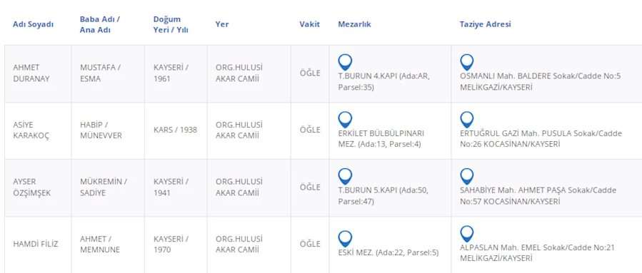 Kayseri Büyükşehir Belediyesi'nden alınan bilgilere göre, vefat eden vatandaşlarımızın bilgileri şu şekilde: