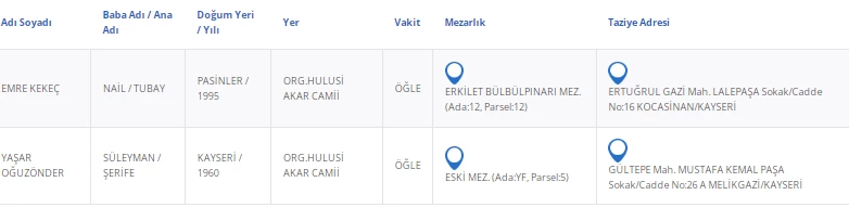 Kayseri Büyükşehir Belediyesi'nden alınan bilgilere göre, vefat eden vatandaşlarımızın bilgileri şu şekilde: