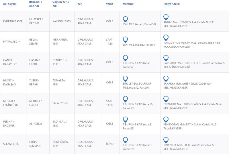 Kayseri Büyükşehir Belediyesi'nden alınan bilgilere göre, vefat eden vatandaşlarımızın bilgileri şu şekilde:
