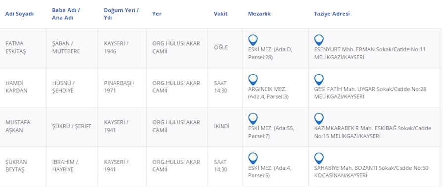 Kayseri Büyükşehir Belediyesi'nden alınan bilgilere göre, vefat eden vatandaşlarımızın bilgileri şu şekilde: