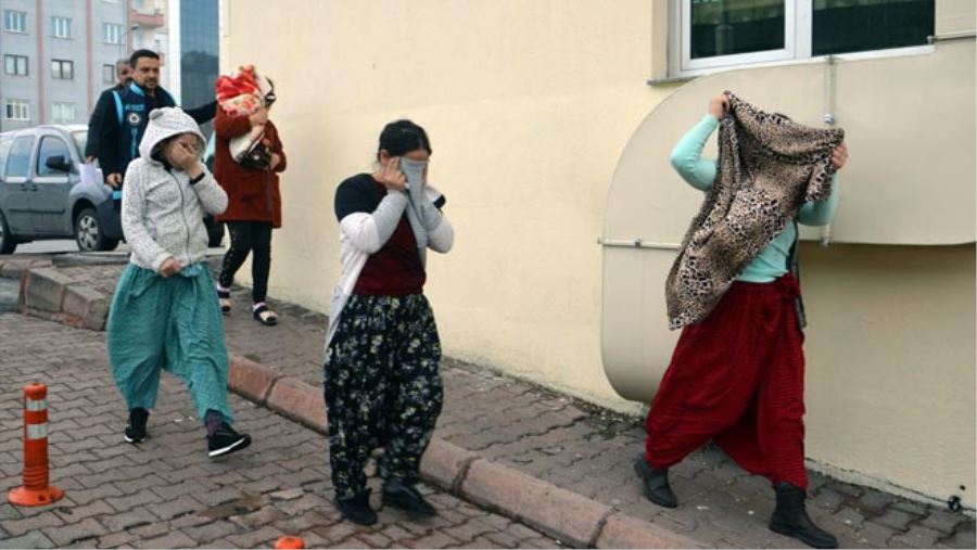 Emniyetteki işlemlerinin ardından adliyeye sevk edilen zanlılardan bazıları eşarp veya kucağındaki çocukla yüzlerini gizlemeye çalıştı.