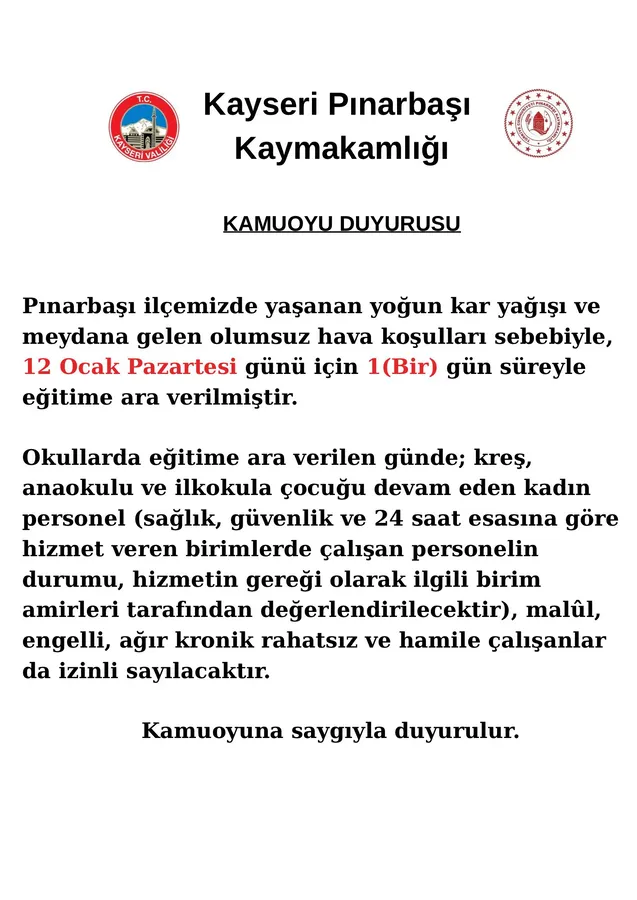 Pınarbaşı Kaymakamlığı tarafından yapılan açıklamada, yoğun kar yağışı ve hava şartları sebebiyle 12 Ocak Pazartesi günü ilçedeki tüm okullarda eğitime ara verildiği duyuruldu.