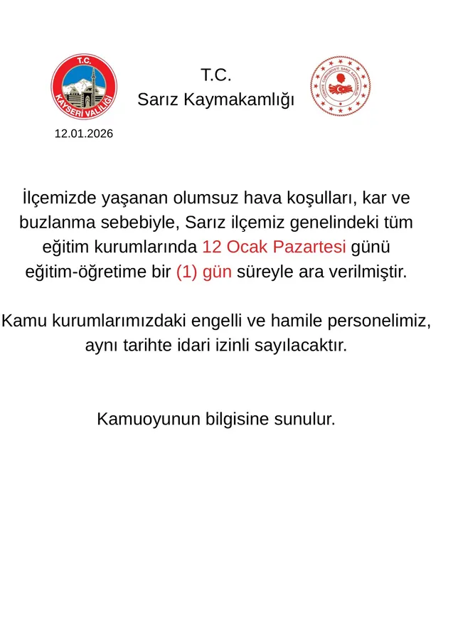 Kayseri’nin Sarız ilçesinde de olumsuz hava koşulları nedeniyle 12 Ocak Pazartesi günü eğitime 1 gün ara verildiği açıklandı. Sarız Kaymakamlığı’nın aldığı kararla ilçedeki tüm okullar tatil edildi.