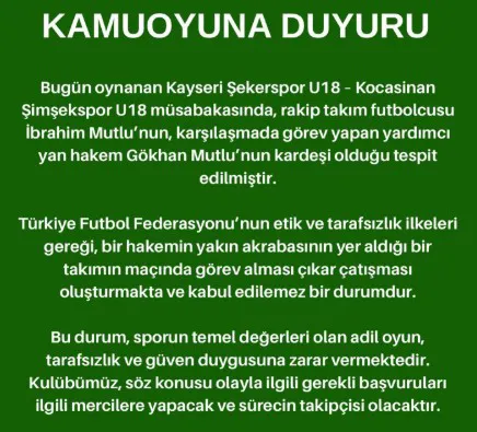 “Bugün oynanan Kayseri Şekerspor U18 – Kocasinan Şimşekspor U18 müsabakasında, rakip takım futbolcusu İbrahim Mutlu’nun, karşılaşmada görev yapan yardımcı yan hakem Gökhan Mutlu’nun kardeşi olduğu tespit edilmiştir.
