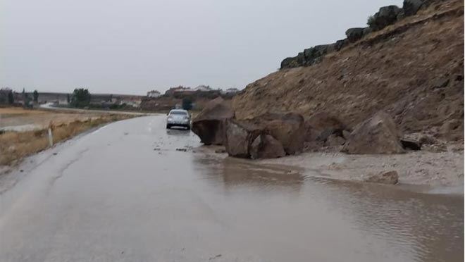 Kayseri'nin Bünyan ilçesinde meydana gelen sel nedeniyle kayalar yola düşerken, bazı evleri de su bastı.