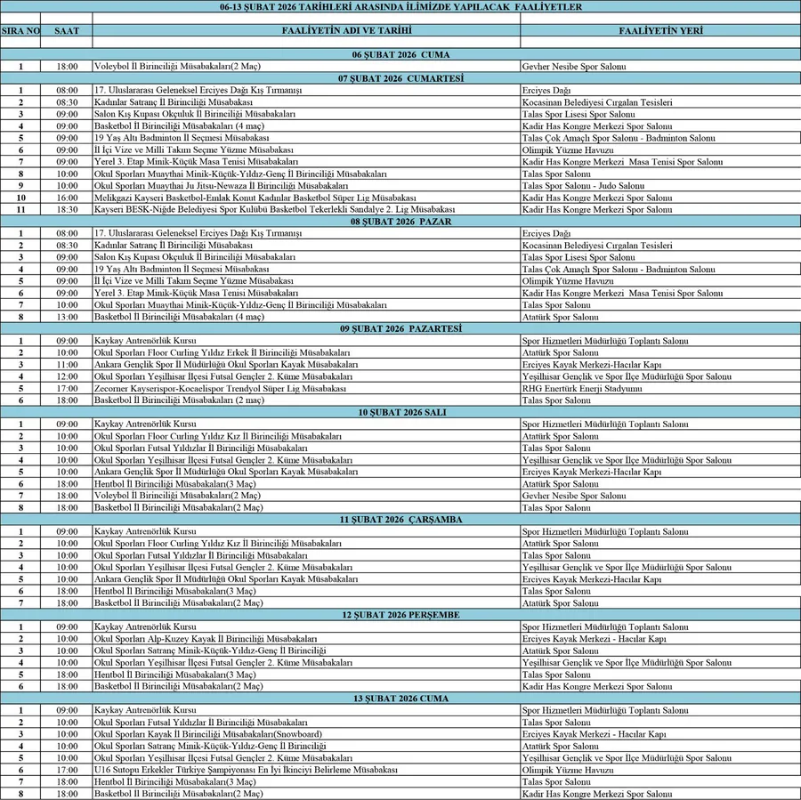 Kayseri’de 6–13 Şubat 2026 tarihleri arasında düzenlenecek spor faaliyetleri belli oldu. Kayseri Gençlik ve Spor Müdürlüğü, kent genelinde bir hafta boyunca gerçekleştirilecek müsabaka, turnuva ve organizasyonları kapsayan ayrıntılı etkinlik takvimini sosyal medya hesabından paylaştı.