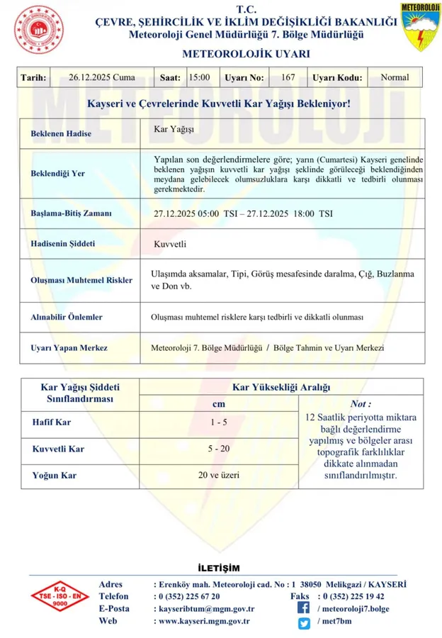 Kayseri Meteoroloji 7’nci Bölge Müdürlüğü yetkililerinden alınan bilgiye göre, kuvvetli kar yağışının yarın sabah saat 05.00’te başlaması ve akşam 18.00’e kadar etkisini sürdürmesi bekleniyor. Kar yağışının Kayseri genelinde etkili olacağı belirtilirken, vatandaşların olası olumsuzluklara karşı dikkatli ve tedbirli olması istendi. Meteoroloji tarafından yapılan uyarıda; ulaşımda aksamalar, tipi, görüş mesafesinde daralma, çığ riski, buzlanma ve don olaylarının yaşanabileceğine dikkat çekildi.
