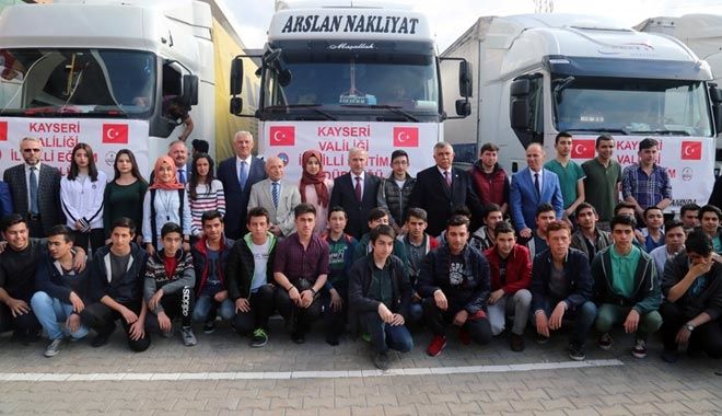 Vali Süleyman Kamçı, Kayseri İl Milli Eğitim Müdürlüğü tarafından Cerablus´taki öğrencilere gönderilmek üzere toplanan 10 tırlık yardım malzemesinin yola çıkması öncesi düzenlenen törene katıldı.
