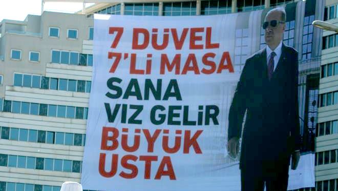 Toplu açılış töreni için Kayseri'de bulunan Cumhurbaşkanı Recep Tayyip Erdoğan'ın konuşacağı Cumhuriyet Meydanı'na '7 düvel 7'li masa sana vız gelir büyük usta' yazılı dev bir pankart asıldı.