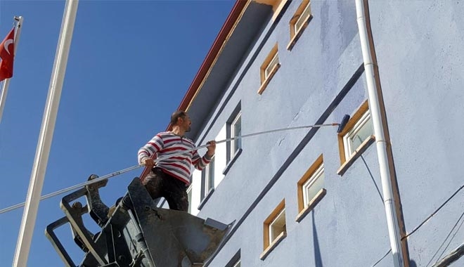 Niğde´de Okul Müdürü Kayserili Ahmet Özkan, okulun boyanması için 5 bin TL masraf çıkınca ´Kayserili zekası´ dedirtecek bir davranışla kolları sıvayarak tüm binayı kepçe üzerinde tek başına boyadı.