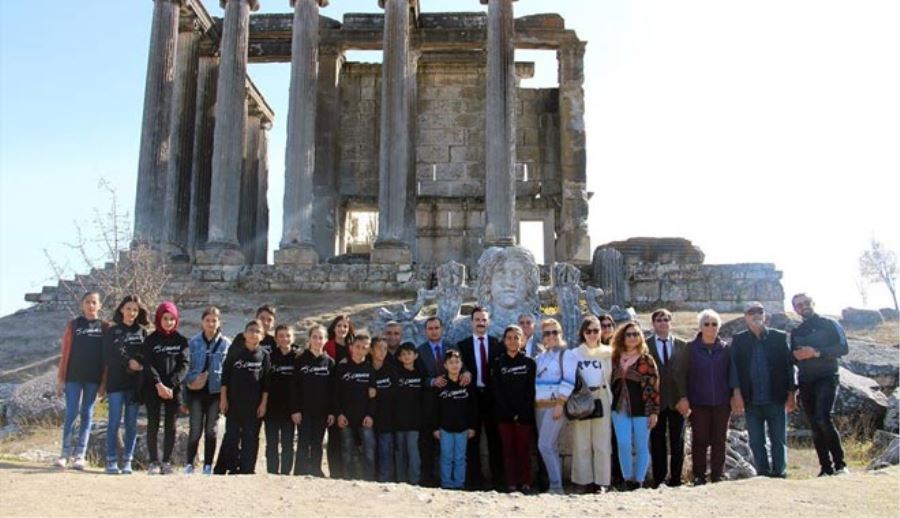 Kaymakamlık rehberi tarafından protokol ve öğrencilere, Roma döneminden kalma Aizanoi Antik Kenti’nde bulunan, Zeus Tapınağı, Stadyum- Tiyatro Kompleksi ve dünyanın ilk borsalarından biri olan Aizanoi Macellum hakkında detaylı bilgiler verildi.