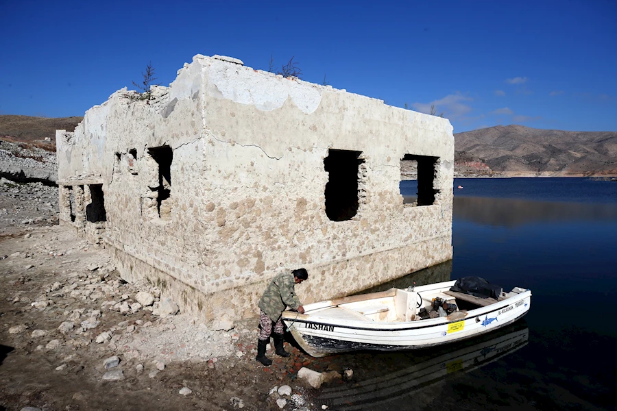 Sabahın ilk ışıklarıyla baraj gölüne açılan Taşhan, kuraklığın etkisiyle ortaya çıkan eski mahallesindeki yapıların yanından tekneyle geçerek ağlarını suya atıyor.