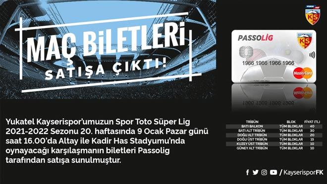 Bilet fiyatlarına ilişkin Kayserispor resmi sosyal medyasında yapılan açıklamada şu görüşlere yer verildi: “Yukatel Kayserispor’umuzun Spor Toto Süper Lig 2021-2022 Sezonu 20. haftasında 9 Ocak Pazar günü saat 16.00'da Altay ile Kadir Has Stadyumu’nda oynayacağı karşılaşmanın biletleri Passolig tarafından satışa sunulmuştur.”