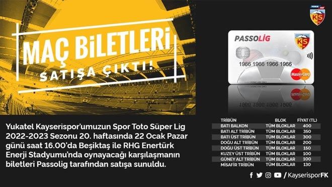 Pazar günü oynanacak Kayserispor-Beşiktaş maçının bilet fiyatları belli oldu. Biletler, Passolig tarafından satışa sunuldu.
